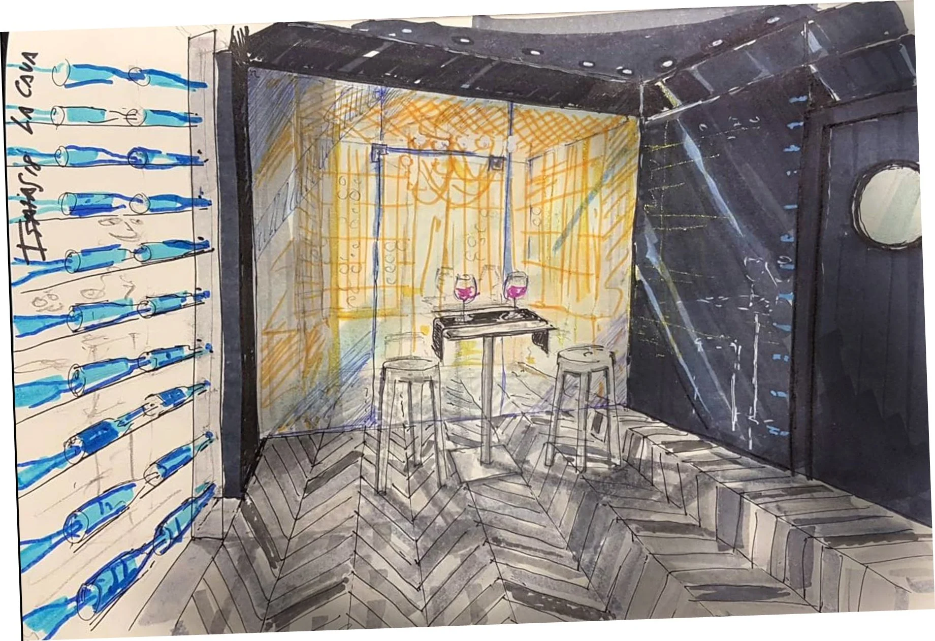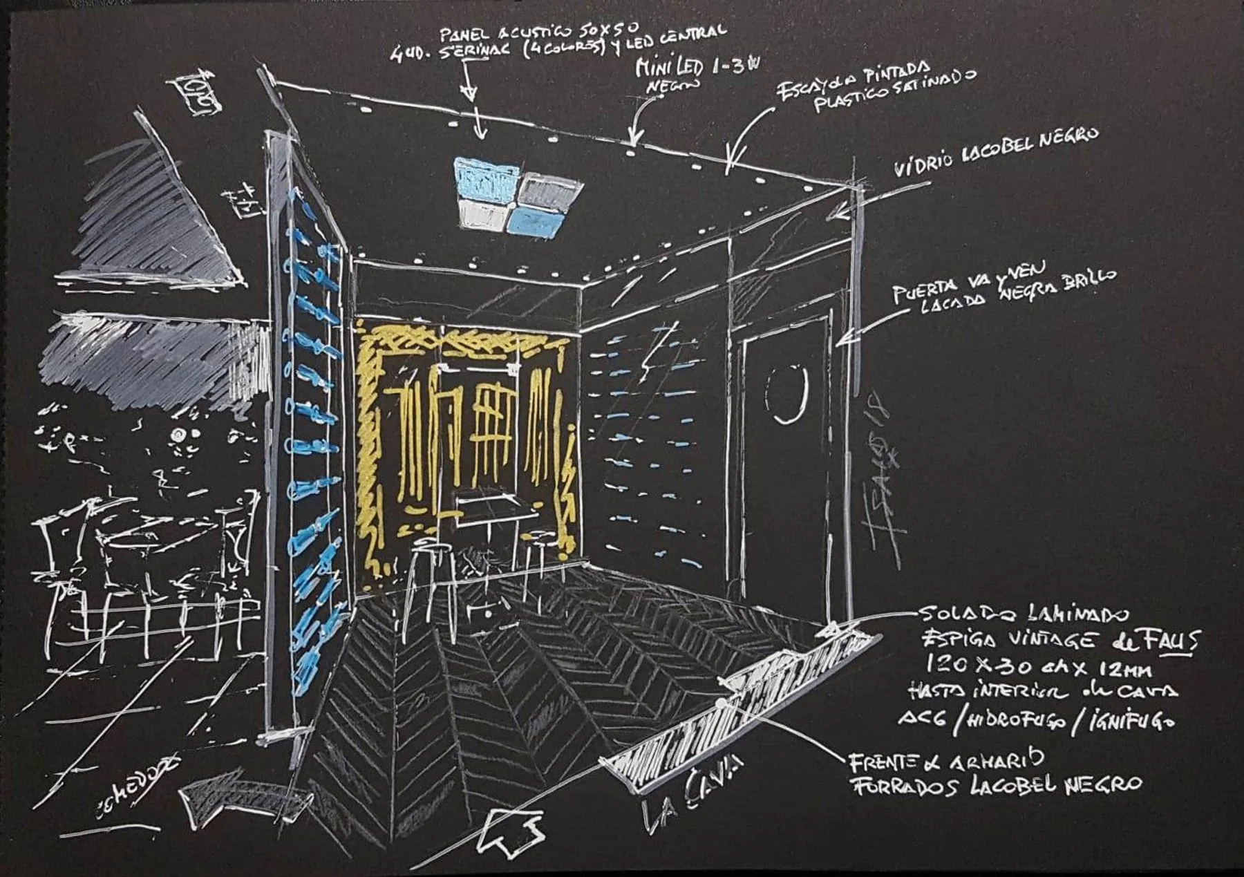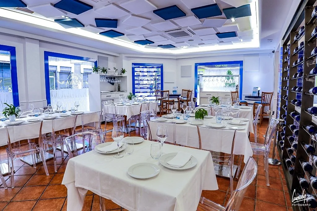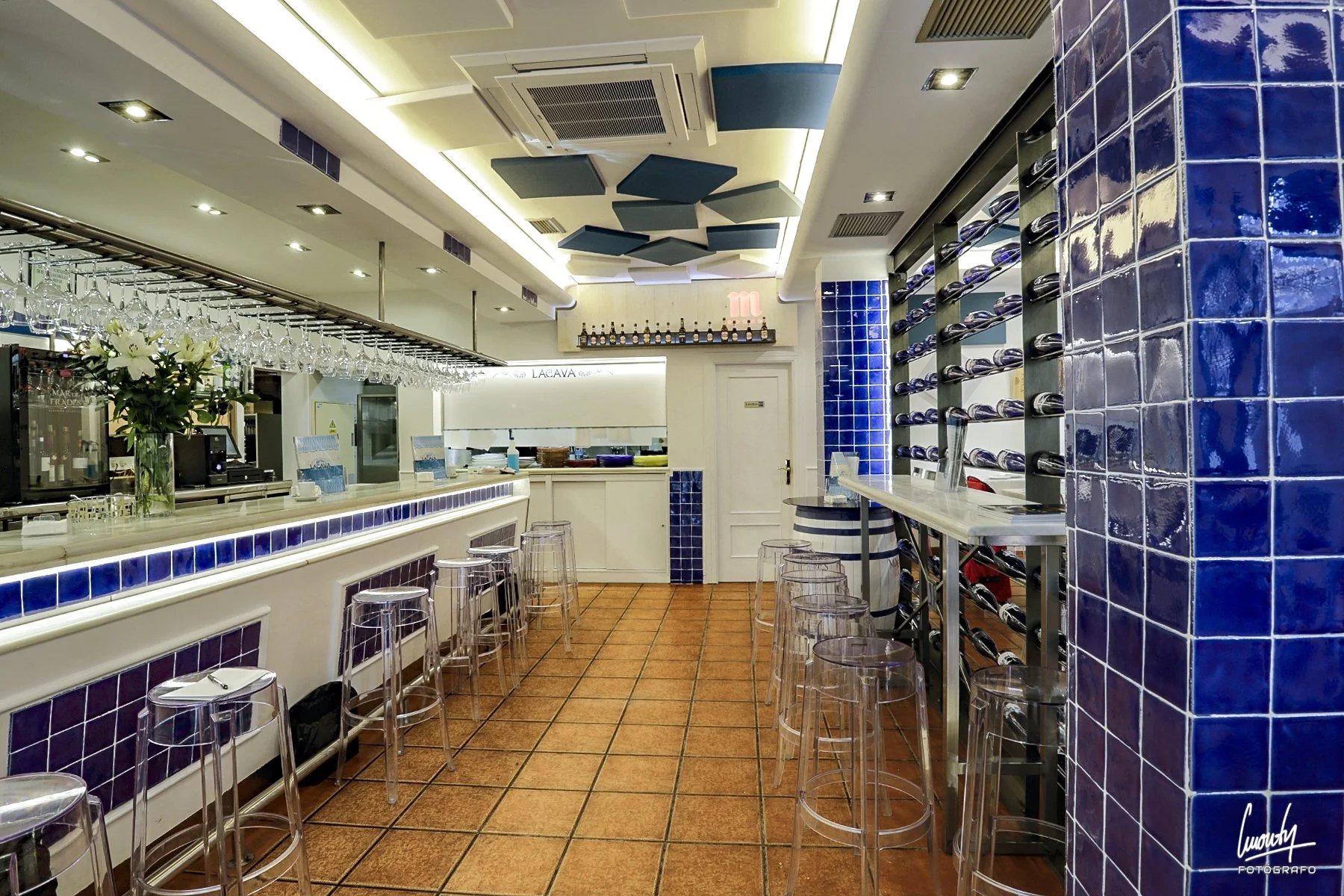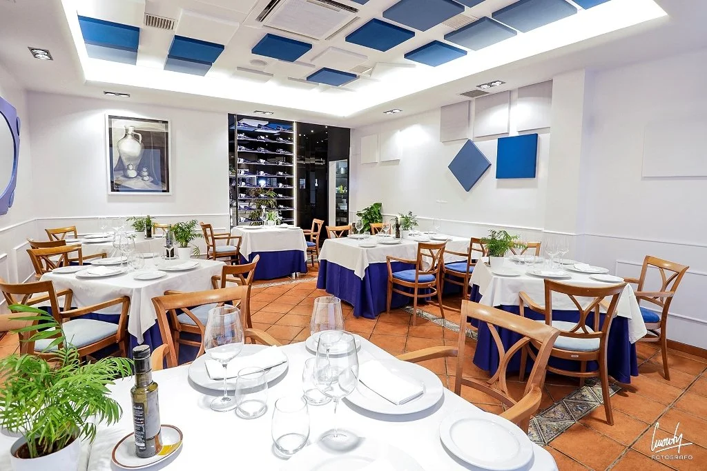 Son los colores de la mancha, también del mediterráneo, de la costa, del mar . / Luz, alegria, , dinamismo, contrastes, brillos y reflejos. / De aromas que invitan al buen comer y mejor beber, de algo de ensoñación...de eso va esta propuesta. / Espacialidad e inter-conexión entre distintos espacios unidos por las texturas y los colores. / Sensación de amplitud y luz. Paneles acústicos Basic de Serinac Ecocero en azules y blancos arrastrados por las olas de mar.